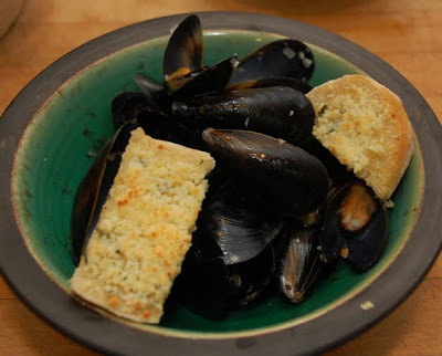 First you saute the minced items, then add the wine, cream, and seasonings and bring it all to a boil. Pile in the mussels and put on the lid and simmer for 5 to 6 minutes. I used Shaun’s Le Creuset wok. It’s the perfect size for 5 lb. of mussels. Only 2 of the mussels didn’t open. We ate the opened mussels with garlic cheese bread using bread Dave had baked that morning.